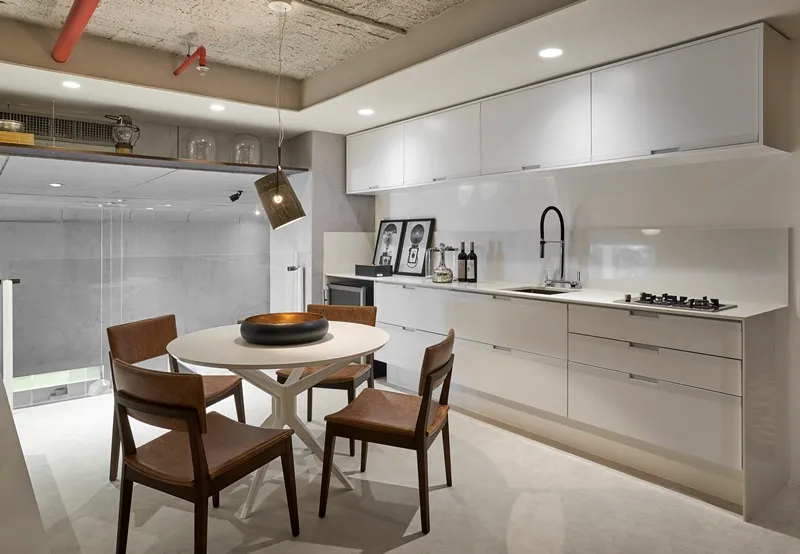 Em cozinhas integradas à sala de jantar, é interessante optar por uma mesma temperatura de cor. Nesta cozinha, a luz branca foi a escolhida.