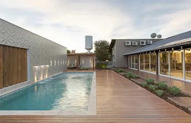 Para a piscina desta casa localizada no interior paulista, a arquiteta se inspirou no incrível visual oferecido pela paisagem. A piscina é diretamente ligada à área interna da casa, oferecendo uma opção de lazer integrada e aconchegante, já que a piscina projetada em linhas retas funciona como um espelho d’água: basta descer um degrau para ficar com os pés submersos tomando sol. No revestimento, as pastilhas de porcelana reforçam o ambiente em sincronia com a natureza.