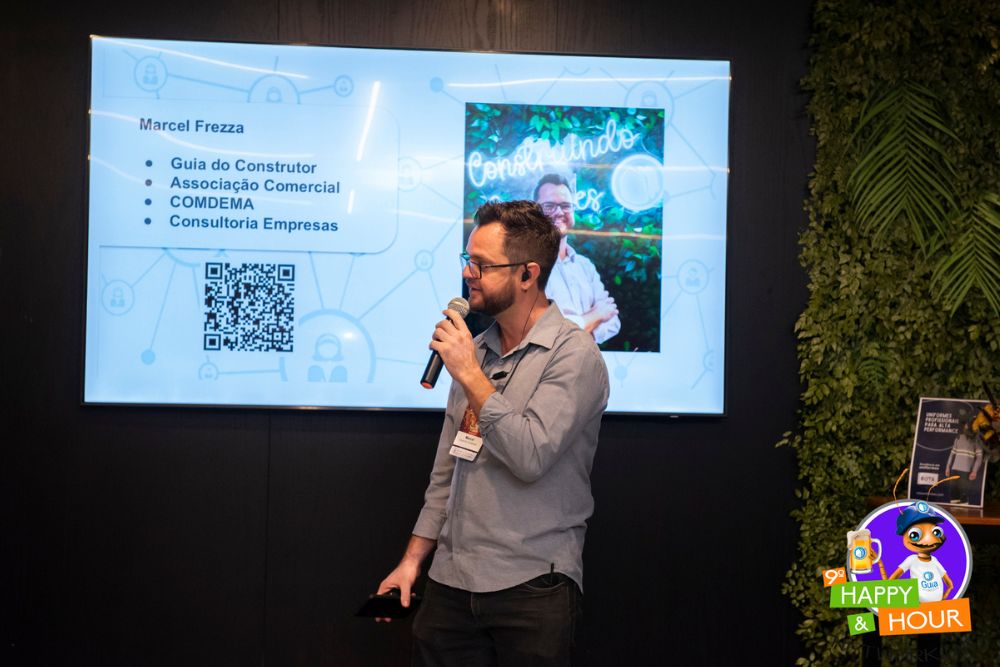 Marcel Frezza, criador do Guia do Construtor, conta: “A ideia de criar o evento do Happy Hour era criar um espaço seguro para empresários da área da construção poderem se conectar, não apenas os anunciantes do Guia, mas também os parceiros dos nossos anunciantes que fazem parte dessa área. Reunir essa galera de uma maneira descontraída para criar parcerias, ter dinâmicas simples e objetivas para que eles quebrem o gelo, interajam e não fiquem sem conversar com ninguém, além de trazer uma palestra interessante da área.” Marcel ainda acrescenta: “E essa edição foi especial, com a Rodada de Negócios como um adicional, que a gente sempre faz mas só uma vez por ano.”