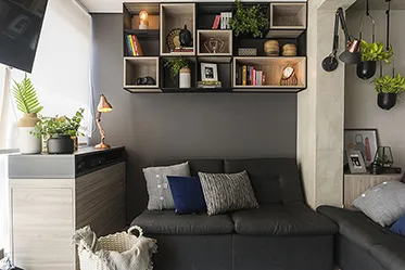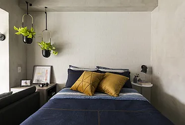 No apartamento com apenas 34 m², foram evidenciados dois pontos da iluminação indireta. Na mesa lateral posicionada ao lado da cama do jovem morador, a luminária fixada na parede traz a meia luz e facilita a leitura. Já no sofá com dupla função, a escolha foi de uma luminária articulada posicionada diretamente no móvel. A ambientação fica perfeita para o clima intimista da temporada que estamos iniciando.