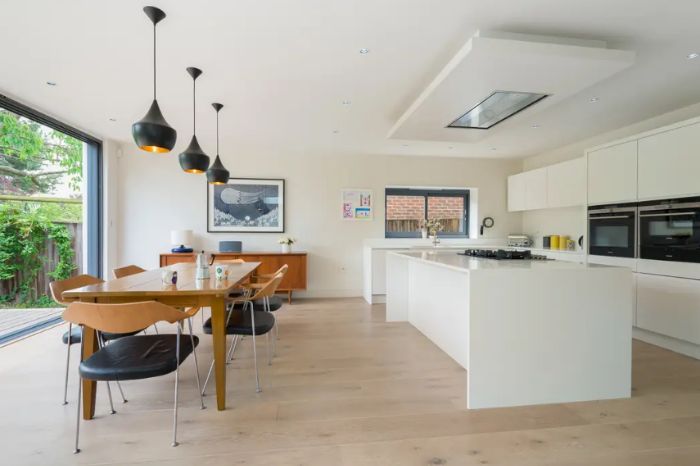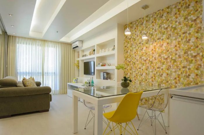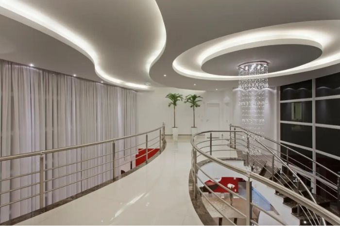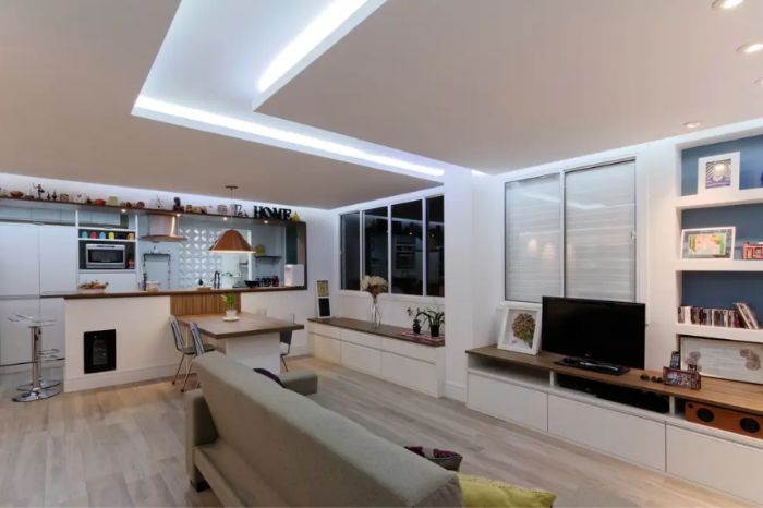Neste projeto, o forro de gesso rebaixado ganhou sancas com rasgos de luz, que possibilitam a propagação da luz. Estes rasgos podem ficar vazios ou ser preenchidos por acrílico ou vidro.