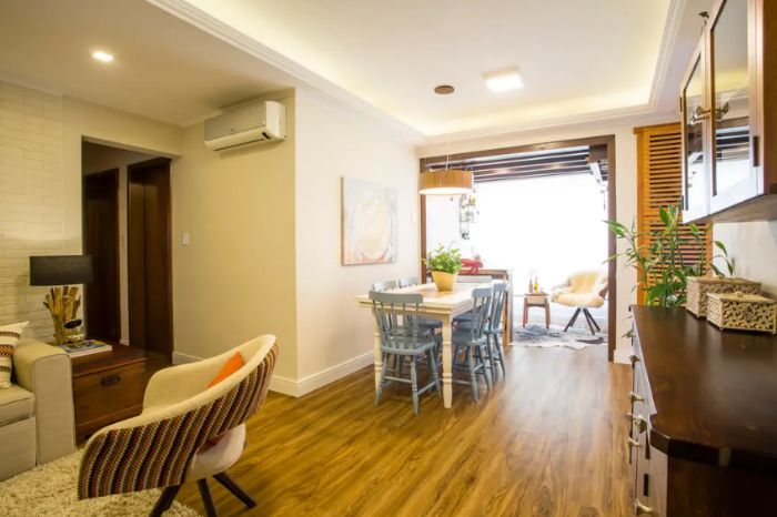Neste apartamento vemos um forro de gesso acartonado com sanca aberta, já que a moldura fica voltada para o centro do espaço. Na sanca é embutida a iluminação, que reflete no morro e cria este efeito visual incrível.
