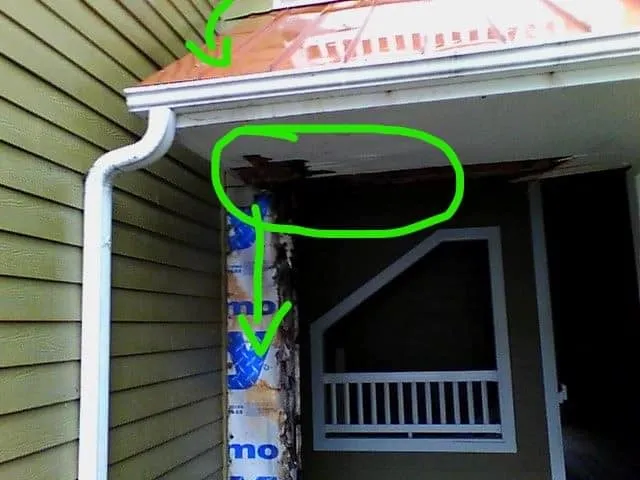 Essa conexão da calha que circulava no canto superior esquerdo da primeira foto teria sido uma solução simples quando a calha entupiu pela primeira vez e a evidência de água correndo pela calha e pela parede foi notada pela primeira vez. Mas, sem atenção, a umidade finalmente se infiltrou, indicada pelas setas nas fotos, a madeira nas paredes, o teto e os trilhos neste caso em particular. O que começou como uma simples limpeza de calha e, talvez, algum reparo repentino se tornou, com o tempo, um grande dano estrutural, exigindo que um engenheiro licenciado verificasse a extensão do dano estrutural à madeira causado pelo extenso apodrecimento. Com mais custos e trabalho no final.
