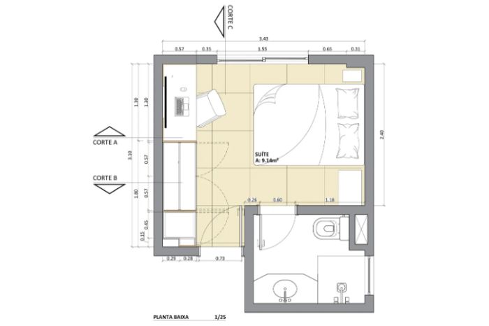 - Banheiros: 0,60 x 0,60 m;