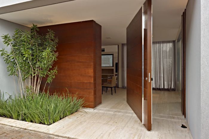 O modelo de porta de fachada mais queridinho dos arquitetos hoje em dia é a porta pivotante, pois ela oferece um design diferenciado, o de uma porta com janela. Nesse sistema a porta apresenta um eixo em torno do qual ela é girada, e as medidas são as mais variadas dependendo do espaço oferecido. Quando compradas prontas as medidas normalmente são 220 x 120 cm (altura x largura), porém há a opção de fazer a porta sob encomenda, o que amplia em muito as possibilidades de tamanho. Por isso ela é a menina dos olhos de qualquer arquiteto, pois a possibilidade de fachadas diferenciadas e com designs únicos é infinita. Na imagem acima podemos ver um modelo de porta pivotante feita sob medida para este espaço.