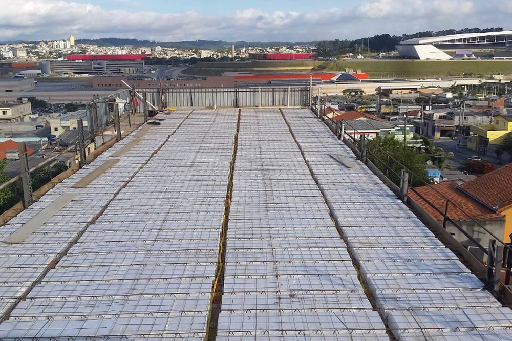 Após concluída essa etapa, é hora de se lançar a malha soldada para que a gente possa preparar a laje para concretagem. Nesse momento é extremamente importante que o profissional responsável pelo projeto estrutural faça uma vistoria para conferir a ferragem das vigas, a tela, as amarrações das lajes e, principalmente o fibramento. As escoras que estão na parte inferior que mantém a laje apoiada. Verificando se há os travamentos dos pontaletes e o calçamento adequado com relação a eles.