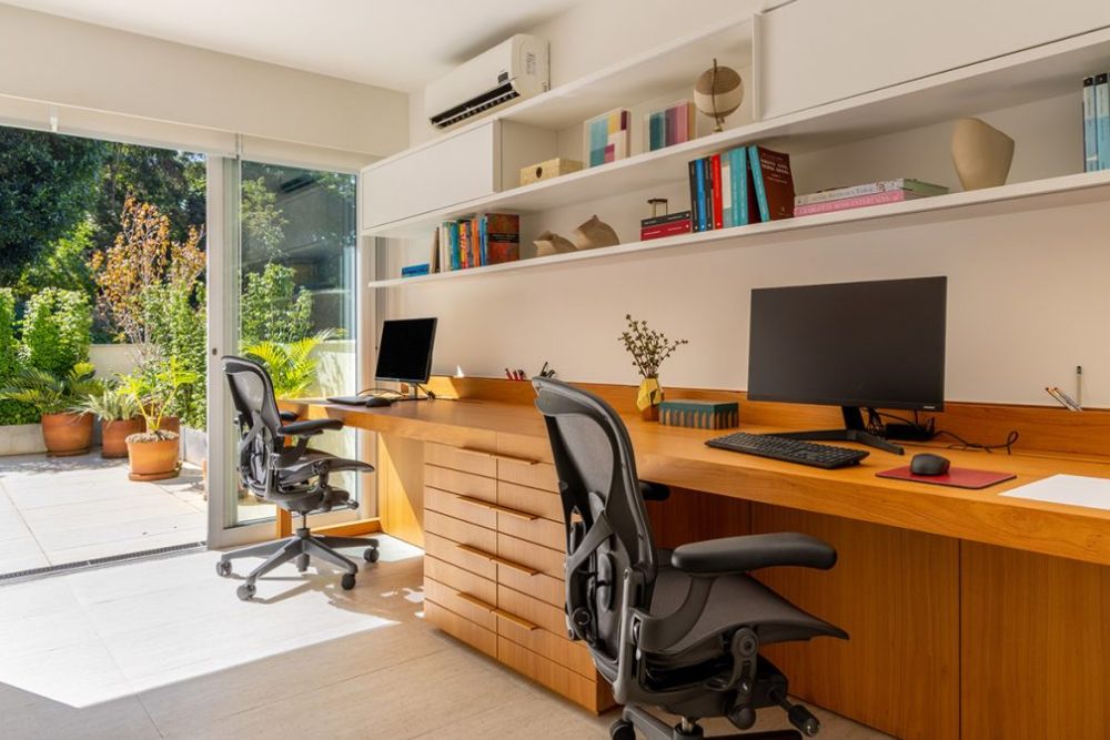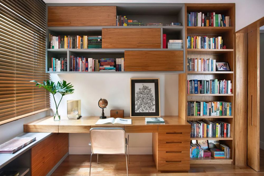 - Cores neutras: Facilitam a integração do home office com o restante da casa.