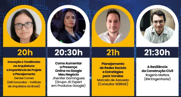 No ciclo de palestras, cinco especialistas dividiram seus conhecimentos e experiências, na seguinte ordem: “Os 5 Passos para um Networking Eficaz”, com Hygor Duarte (mentor de empresários, consultor financeiro e CEO do Grupo FAST, que fundou há 9 anos); “Inovação e Tendências da Arquitetura: a importância do Projeto e Planejamento, com Denise Correa (Instituto e Arquitetura do Brasil/IAB); “Como Aumentar a Presença Online no Google Meu Negócio” (Jhenifer Domingues (Grupo JD Expert em Produtos Google); “Planejamento de Redes Sociais e Estratégias para Vendas”, com Marcelo de Azevedo (Consultor SEBRAE); e “A Resiliência da Construção Civil, com Rogério Mattos (RM Engenharia).