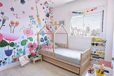 Para o dormitório da filha mais velha, o adesivo reproduz a alegria da natureza e suas diversas espécies de flores e cores. A cama, com estrutura de casinha, transmite proteção para a menina, além de reforçar o clima lúdico do quarto. “Um cantinho para os livros também era essencial”, explica a arquiteta.