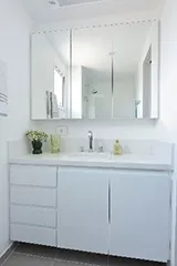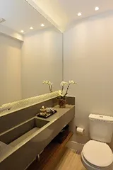 O casal solicitou que o lavabo oferecesse um estilo mais sofisticado. O resultado foi obtido por meio da especificação dos acabamentos, como as pastilhas na parede do espelho e a iluminação. O banheiro dos moradores segue o estilo clean com paredes, móveis e louças na cor branca.