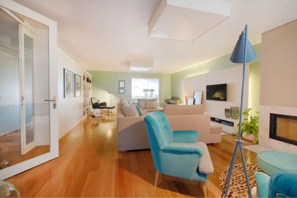 Nesta sala, apenas algumas paredes aparecem pintadas em cores mais fortes. São paredes que materializam pontos estratégicos no espaço e que surgem como um statement(uma afirmação) na decoração. Podemos ver estas superfícies, pintadas de uma cor distinta, como sendo uma separação visual ou um ponto que chama a atenção. Isto funciona especialmente bem numa sala pequena, pois dá a ilusão de que o lugar é mais amplo do que realmente é.