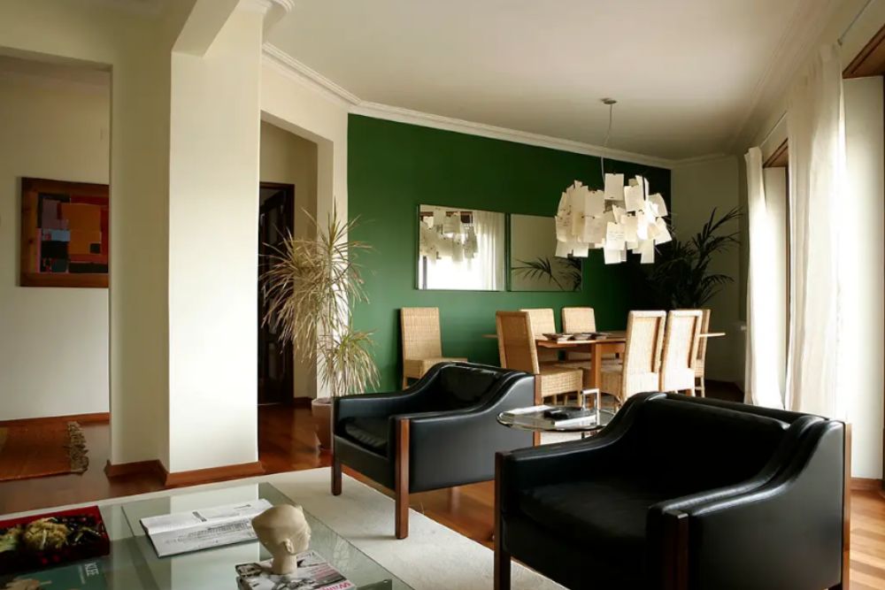 Se optar por um verde mais escuro, como o do exemplo, pode escolher não pintar todas as paredes dessa cor ou até misturá-la com tons mais claros, como um branco ou um bege, de forma a não pesar muito o ambiente.