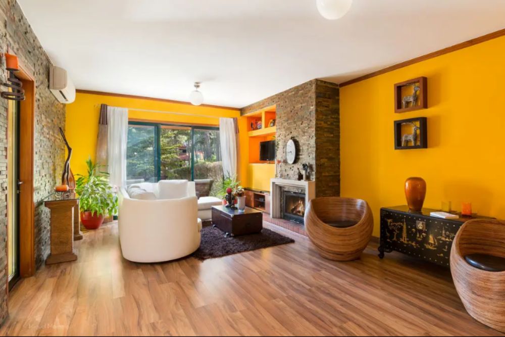 As combinações mais seguras e suaves são feitas com as cores análogas, ou seja, cores que estejam lado a lado no círculo cromático, tal como o laranja, o verde e o azul. A harmonia com cores análogas cria sempre uma mistura menos contrastante, mas muito agradável visualmente. Nesse caso, o amarelo combinou muito bem com o tom da madeira e das pedras, trazendo um ar aconchegante e caloroso pra sala de estar.