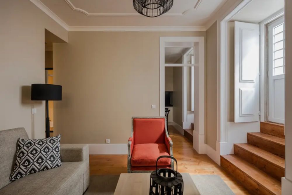 Bastante apropriada pela moda e pelos cosméticos, o tom nude é perfeito para ambientes com um estilo de decoração mais clássico e neutro. Esta cor tem a vantagem de combinar facilmente com outros tons, além de nunca sair de moda graças à sua versatilidade. Paredes de cor bege e tetos brancos são também muito comum em decoração de casas portuguesas. Nessa sala, o contraste ficou por conta da poltrona, da luminária em tom escuro e da almofada estampada.