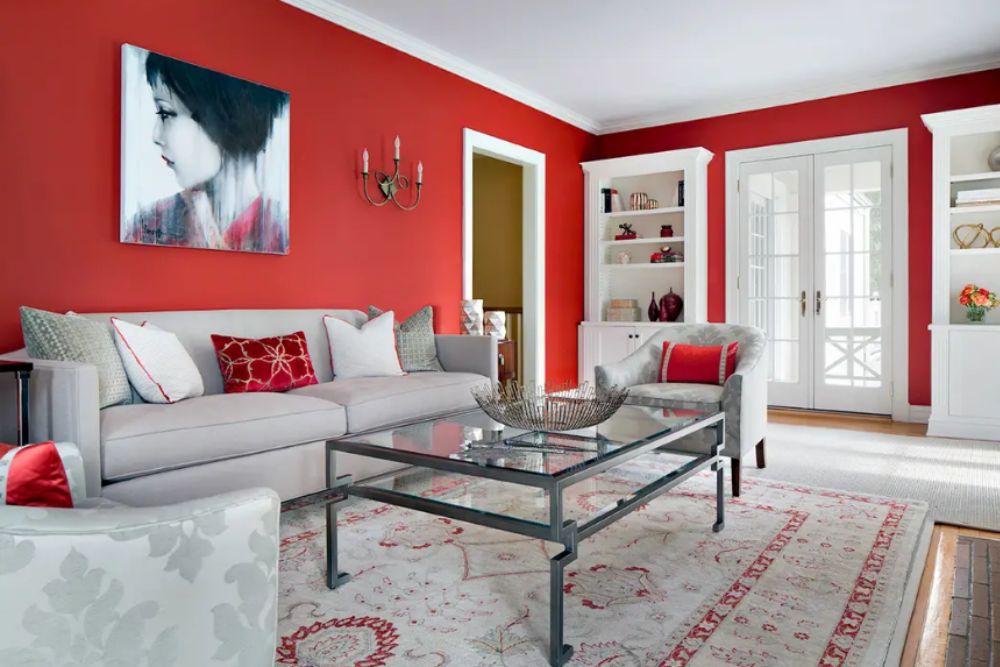 Para as pessoas que gostam de ousar um pouco mais, o vermelho é a cor ideal, já que essa cor tem o poder de assegurar uma energia imediata ao ambiente. O ideal é, porém, equilibrá-lo com móveis e detalhes em branco para criar um contraste e não pesar. Procure sempre pintar o teto com uma cor mais clara do que as paredes, assim ele vai parecer mais alto e, consequentemente, o espaço parecerá maior.