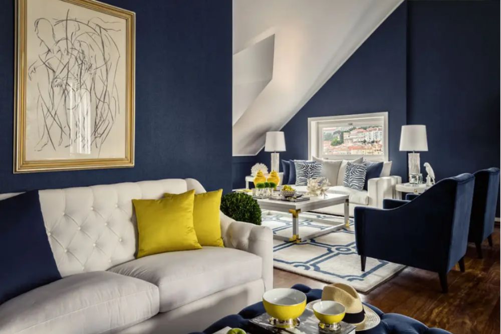 Muito se diz sobre o risco de usar cores escuras nos espaços. Mas, quando bem aplicadas, podem trazer um resultado encantador. Adoramos esta combinação de azul-marinho com toques em amarelo e branco. Por vezes, uma cor pode ter um efeito tão surpreendente e distinto que nos faz esquecer o tamanho do espaço em si. Para não sobrecarregar o ambiente, a dica é escolher móveis em tons neutros, como o bege, branco, off white ou nude.