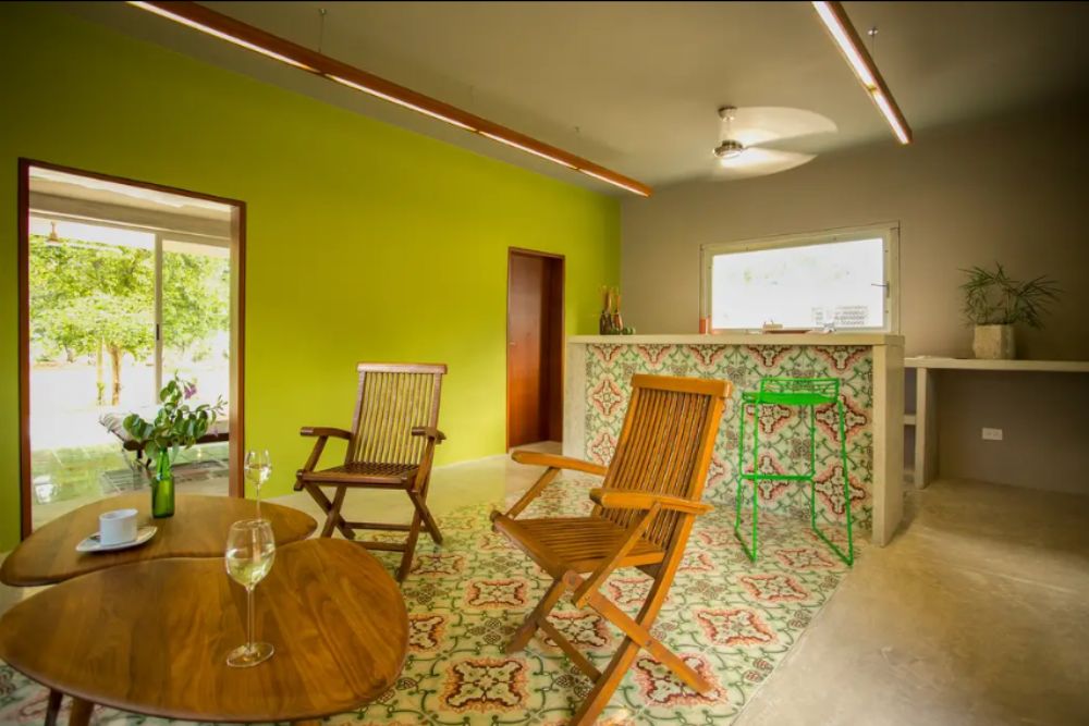 Se você mora numa região quente e a sua sala tem uma boa luz natural, pode optar por um toque tropical com uma parede verde limão. Funciona muito bem para casas de praia ou apartamentos localizados em cidades litorâneas. Neste projeto, apreciamos a ideia de combinar o verde com os azulejos coloridos.