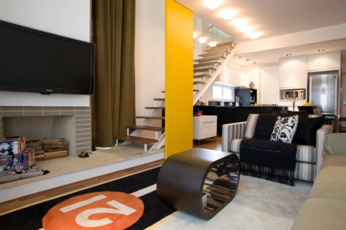 Neste projeto, quase todo o espaço sob a escada de lance único foi incorporado como área útil do living room. A bancada da cozinha se estende até o quarto degrau. Além de salvar espaço, a escada de lance único pode também ornamentar o ambiente, com a adição de detalhes, como o painel metálico, pintado de amarelo, que vemos neste projeto.