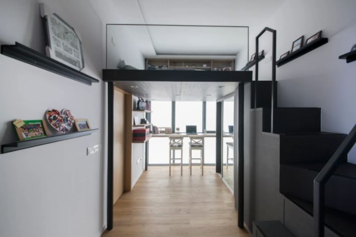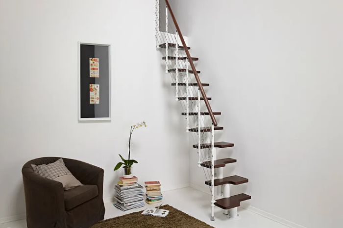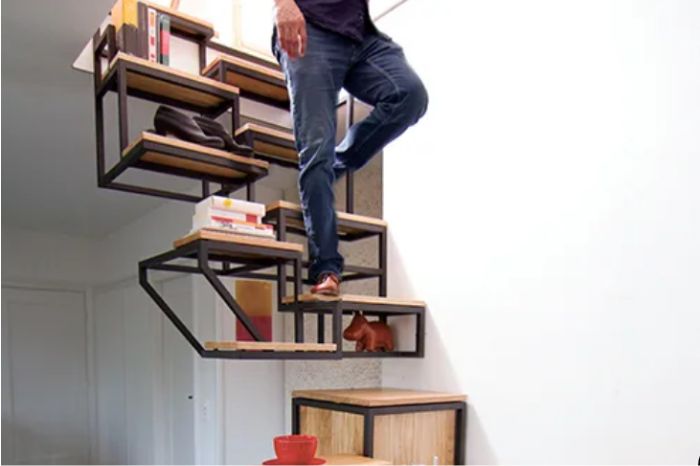 Este tipo de escada é de longe a melhor opção para espaços muito pequenos, pois não ocupa nenhum espaço extra. Portanto, você não perde nenhum centímetro. Mas a desvantagem é o desconforto e a pouca praticidade, pois é preciso um pouco mais de força para subir ou descer e muita criatividade para transportar objetos de um nível para outro. Este modelo é mais indicar para mezaninos e para clientes jovens.