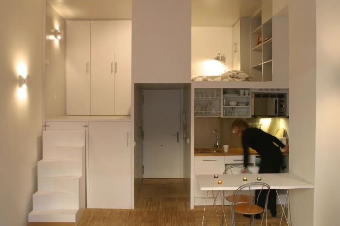 A equipe da Beriot, Bernardini Arquitetos consegue tirar o máximo de proveito dos ambientes, com soluções personalizadas que ocupam o mínimo de espaço. Neste loft, a equipe concebeu uma escada móvel, que abriga um armário, e pode ser movida de lugar, liberando espaço para se abrir as portas do armário fixo, de altura mediana, que por sua vez funciona como o patamar da escada, que leva ao mezanino.