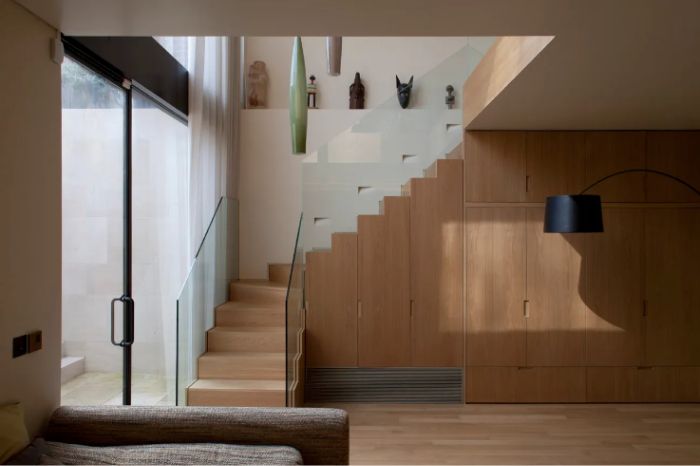 Neste projeto, vemos claramente que o design da escada é mais uma consequência das condições de determinado espaço do que o resultado de um rabisco casual ou o devaneio inspirado de arquitetos. A distância curta entre a borda do piso superior e a parede do pavimento térreo impuseram uma escada em forma de L, cujo espaço inferior foi muito bem aproveitado como armários embutidos.