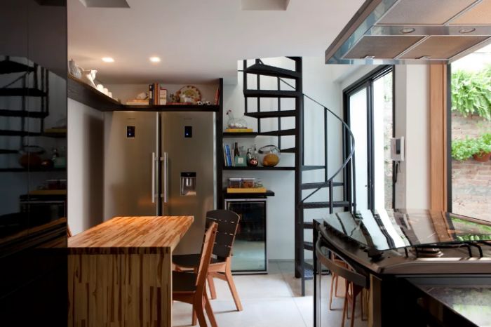 A escada do tipo espiral também é muito empregada em espaços reduzidos, pois ocupa apenas a área de uma circunferência, que varia conforme a sua largura ou o seu diâmetro. A escada espiral é tão compacta, que pode ser instalada em qualquer ambiente, sem estrangulá-lo, como vemos neste projeto.