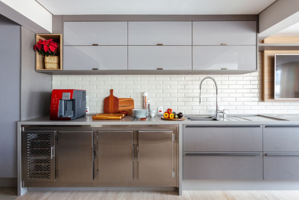 - Eletrodomésticos: Aparelhos que são mais utilizados e que tenham um design interessante e em bom estado, podem ficar aparentes e sempre à mão, como as cafeteiras e torradeiras, por exemplo. Os menores usados podem ser guardados em um armário projetado especialmente para eles.