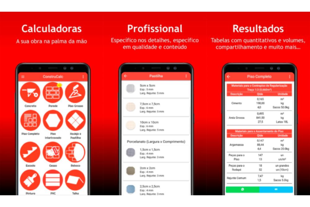 Alguns aplicativos permitem realizar estimativas precisas de cada material a ser usado em uma obra. Com interfaces intuitivas, os apps são voltados para profissionais da construção civil, mas também podem ser usados por pessoas leigas que desejam realizar pequenas obras ou reformas.
