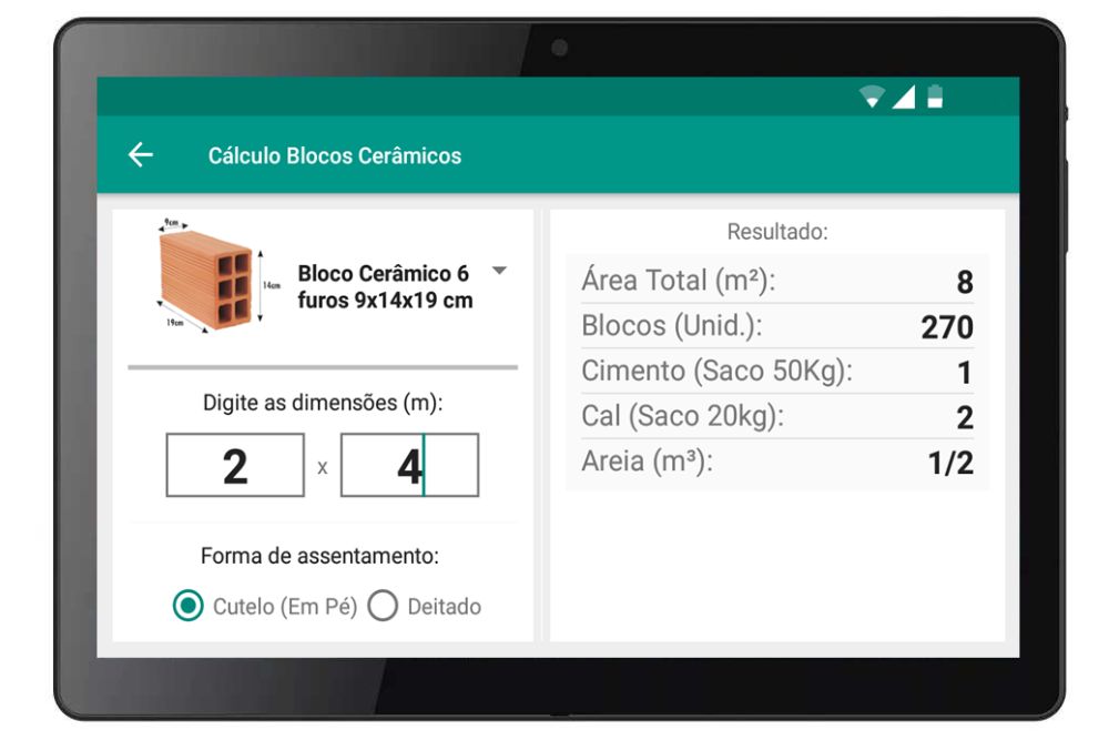 Ele permite calcular materiais como blocos, tijolos, cimento, areia, telhas de cerâmica e de concreto, piso de concreto e contra piso e materiais para chapisco, emboço e reboco.