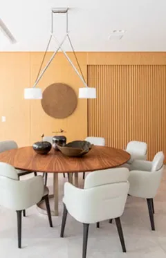 Além dessas observações, a definição da quantidade de assentos no entorno da mesa leva em conta a regra: cada ocupante da mesa deve ter um espaço entre 60 cm e 70 cm de largura. “Esse cálculo é determinante”, revela.