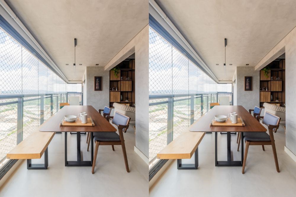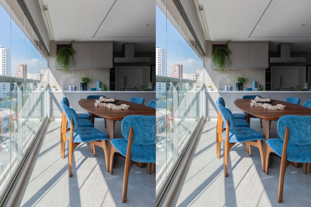 - Conversão dos espaços: O envidraçamento permite que a extensão da varanda seja integrada ao restante do lar, criando um espaço funcional que pode ser usado como sala de estar, jardim de inverno, escritório, ou até mesmo um local para refeições. “Em apartamentos menores, onde cada metro conta, o fechamento é extremamente atrativo para ganhar uma área a mais”, diz.