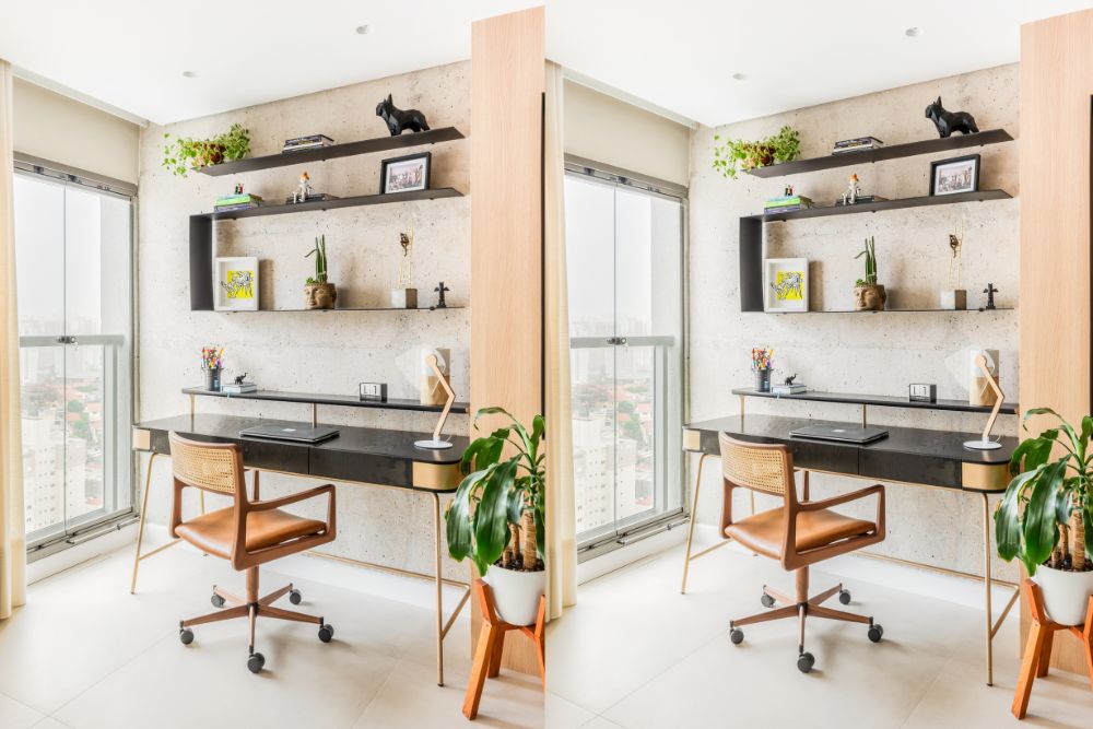 O cantinho do home office, posicionado na varanda integrada e vedada com vidro, é uma ótima opção para aproveitar a luz natural, principalmente para quem trabalha em casa | Projeto BMA Studio | Foto: Guilherme Pucci
