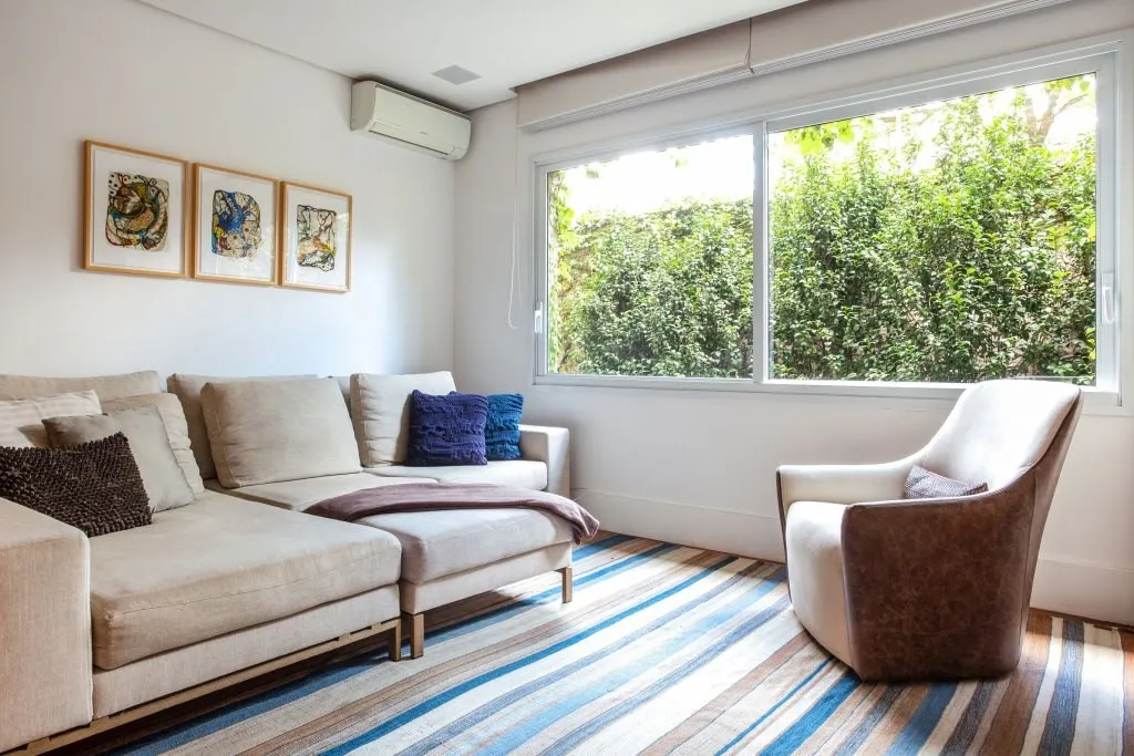• Esquadrias de alumínio: Bastante empregadas devido às vantagens do material, costumam registrar um preço superior. Em contrapartida, resultam em menor manutenção, são resistentes e duráveis – principalmente em áreas externas –, e estão disponíveis em diversas cores. Como ponto negativo, o baixo isolamento termoacústico pode influir no conforto da casa. Todavia, o emprego de vidros duplos e perfis maiores melhoram a performance.