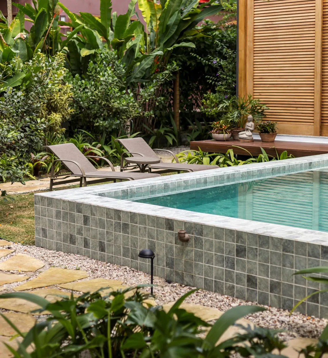 Projeto de Flavia Menezes com o revestimento Fiji (OMD14952), no formato 10cm x 10cm dentro e fora da piscina. Foto de JP Image |