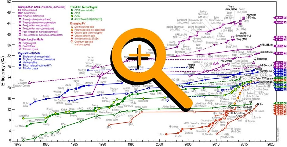 Gráfico: Aumento da Eficiência das células Fotovoltaicos nos últimos 20 anos