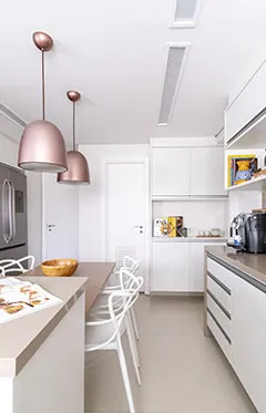 Por mais conforto e funcionalidade, os moradores solicitaram uma cozinha clara e aconchegante, com revestimentos e materiais homogêneos, sem grandes desenhos e fáceis de limpar. “Em busca de praticidade, sugeri trabalharmos com uma bancada de quartzo mais escuro, com um frontão alto (55 cm) evitando a mistura de materiais. O restante das paredes recebeu pintura acrílica”, enumera a arquiteta. No piso, o porcelanato claro de grande formato apresenta menor área de rejunte e reforça a luminosidade. Essencial para trazer a sensação de acolhimento, o laminado amadeirado reveste o painel e a mesa, aquecendo a decoração”. Por fim, apostaram em uma lousa de vidro ao lado da TV, constantemente recheada de recados e receitas. Respondendo pela iluminação, embutidos no forro cuidam da iluminação central enquanto a dupla de lustres cobre traz um toque de tendência sobre a mesa de refeições.