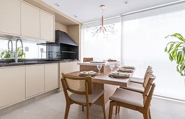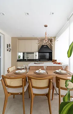 Ao quebrar as paredes e unir copa e cozinha-corredor, o apartamento passou a contar com um ambiente bem distribuído. “A intenção foi criar um grande espaço aberto e integrado, com direito a uma mesa de refeição bem confortável. Ela é muito usada no dia a dia pela família, pois a sala de jantar fica reservada para os dias em que os moradores recebem convidados”.