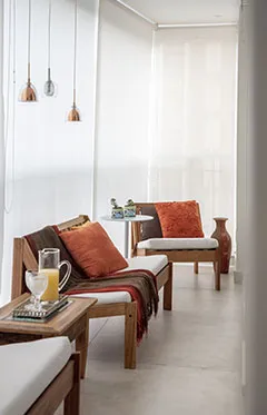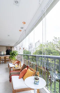 Nem mesmo a área lateral da varanda com churrasqueira foi desperdiçada. A arquiteta transformou num recanto acolhedor com bancos e poltronas de madeira que ficam em frente a sala de estar, além de uma prática mesinha lateral. “É o lugar perfeito para quem deseja ler um livro, ouvir música ou simplesmente relaxar”, finaliza.