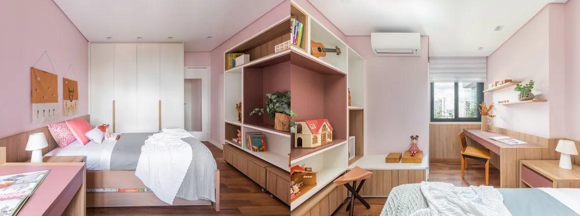 Seguindo a paleta do rosa, o tom pastel acompanha a pintura das paredes e detalhes dos móveis, como a bancada de estudos e lição de casa. Em frente à cama, o charme da marcenaria com nichos guarda os seus brinquedos, mas no futuro está pronto para receber novos livros e objetos que refletirão seus gostos e o crescimento.