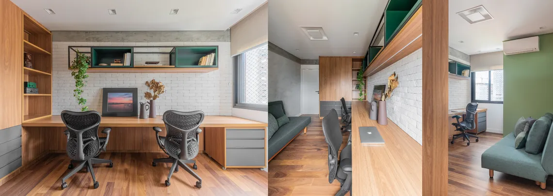 Na versatilidade que o arquiteto Pietro Terlizzi atribui aos projetos, o quarto de hóspedes ganhou uma atribuição constante na rotina familiar: o home office com espaço de sobra para o casal trabalhar juntos. Acompanhando a marcenaria do guarda-roupa, a base da mesa se expande de ponta a ponta e, além do armário de rodinhas, os nichos suspensos de serralheria oferecem espaço de armazenamento para os dois. E onde acomodar um visitante? No sofá-cama disposto no recuo do dormitório.