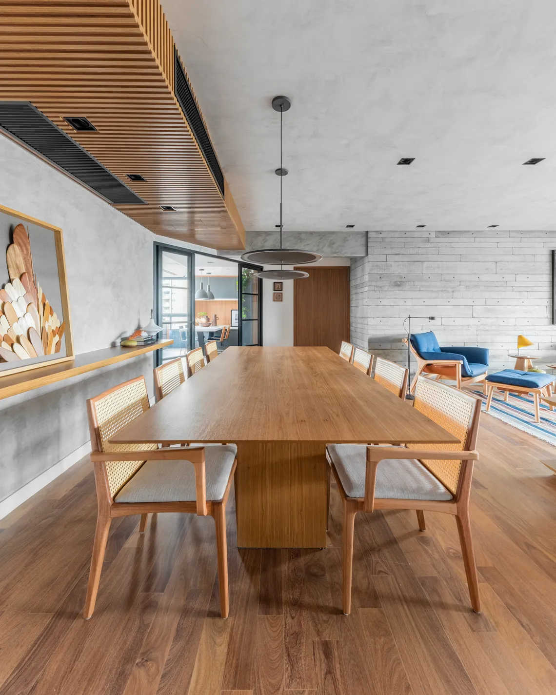 Idealizado pelo arquiteto Pietro Terlizzi, a porta diagonal composta por serralheria e vidro possibilitou uma otimização e um ganho maior de espaço para a sala de almoço dentro da própria cozinha, tornando-a linear e generosa. Já o acesso da cozinha para a sala de jantar trouxe personalidade e profundidade ao espaço, a atmosfera acolhedora é representada pela leveza do amadeirado claro, evidente desde a tonalidade do piso até o efeito ripado no forro - que oculta o ar-condicionado -, bem como a brasilidade da palhinha, que reveste o encosto das 8 posições de cadeira. | Foto: Guilherme Pucci