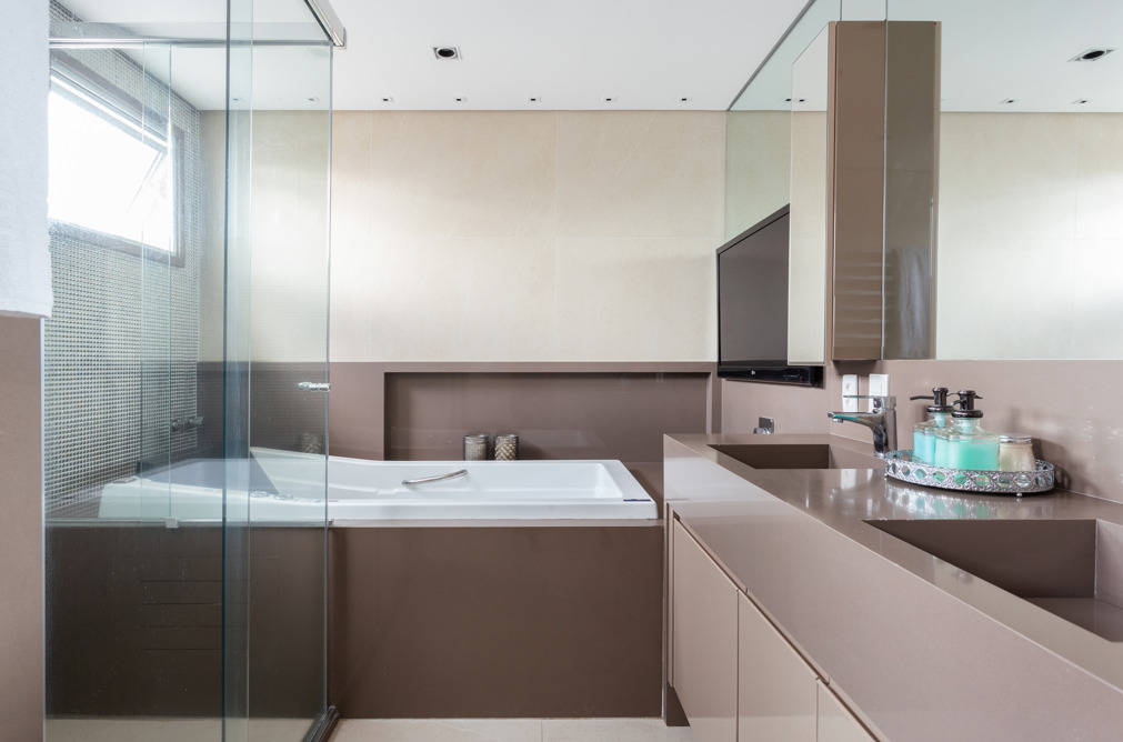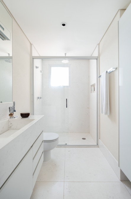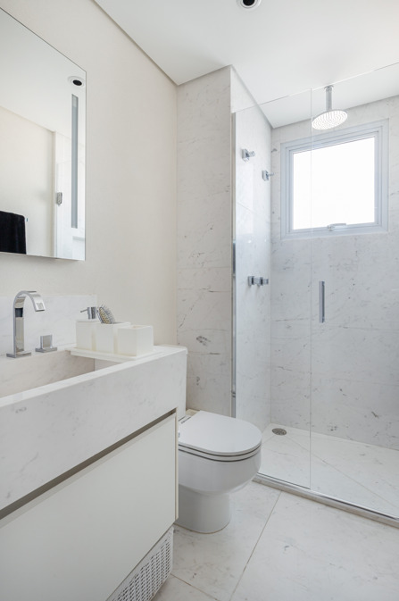 Para garantir o bem-estar proporcionado na hora do banho, é essencial verificar questões como modelo do chuveiro, pressão e vazão da água, além do tipo de aquecimento | Projeto de Dantas & Passos Arquitetura | Foto: Maura Mello
