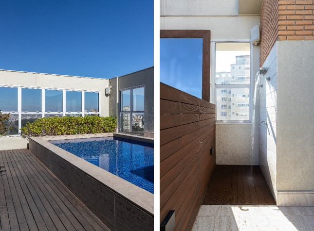 Nessa cobertura, após o banho de piscina, o morador já pode tomar uma ducha relaxante | Projeto de Dantas & Passos Arquitetura | Foto: Maura Mello