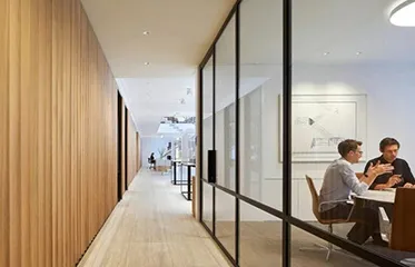 A incorporação de vidraria interna com estrutura de aço oferece uma solução alternativa para a criação de escritórios, uma vez que sua estrutura delicada permite que a divisão de espaços sem criar barreiras sólidas. O efeito cruzado dos vidros com estrutura de aço fornece uma separação sutil que presta homenagem às técnicas tradicionais de vidros. Devido à natureza personalizável dos sistemas de envidraçamento interno com estrutura de aço, as barras cruzadas podem ser projetadas de acordo com as preferências do arquiteto ou designer de interiores.