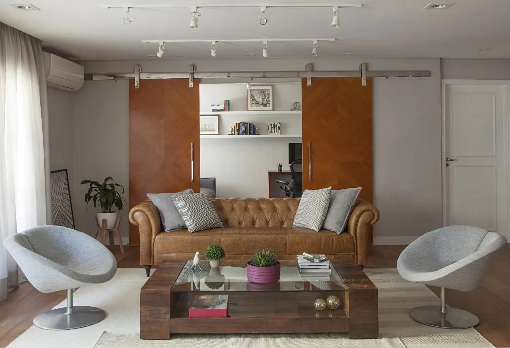 Além do tamanho do sofá, a escolha entre modelos fixos e retráteis é fundamental para a ambientação. Os modelos tradicionais são ótimos para salas de estar, já as peças retráteis, reclináveis e com chaise são recomendadas para ambientes que funcionam também como sala de TV. Muita atenção sobre a seleção do tecido do estofado. “O suede é bastante popular e utilizado, assim como o linho. Os dois podem ser impermeabilizados o que é interessante para a durabilidade”, fala o arquiteto. Outro material bem bacana é o couro, um clássico de ótima durabilidade, excelente para uso intenso e de fácil limpeza, porém, deve ser evitado em lugares muito quentes.